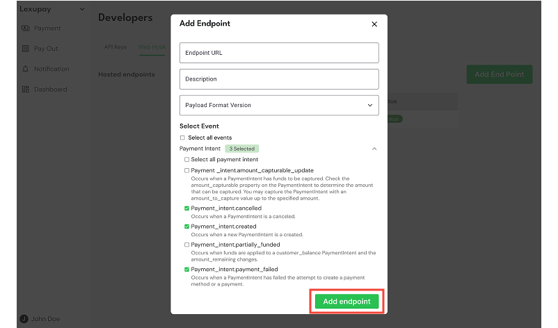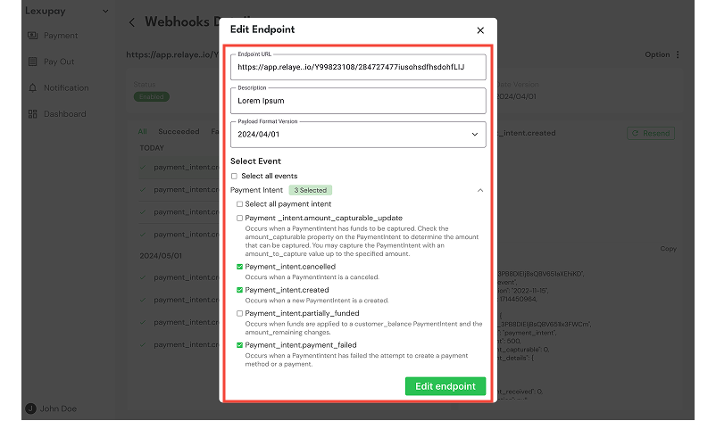 Ensure the endpoint information is correct, including the endpoint URL, description, payload format version, and selected events for payment intents and payouts.