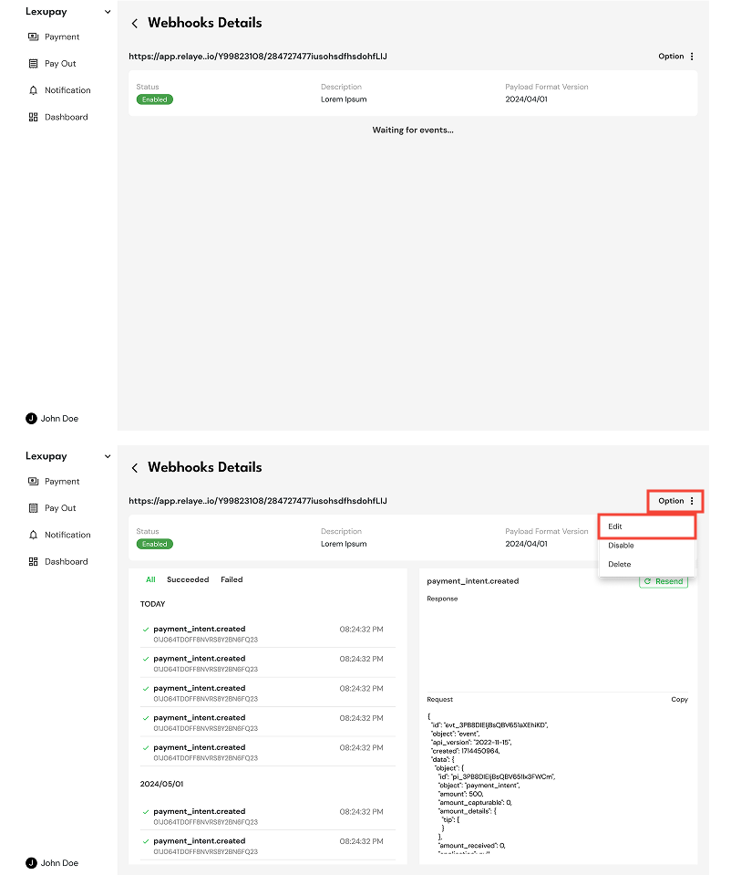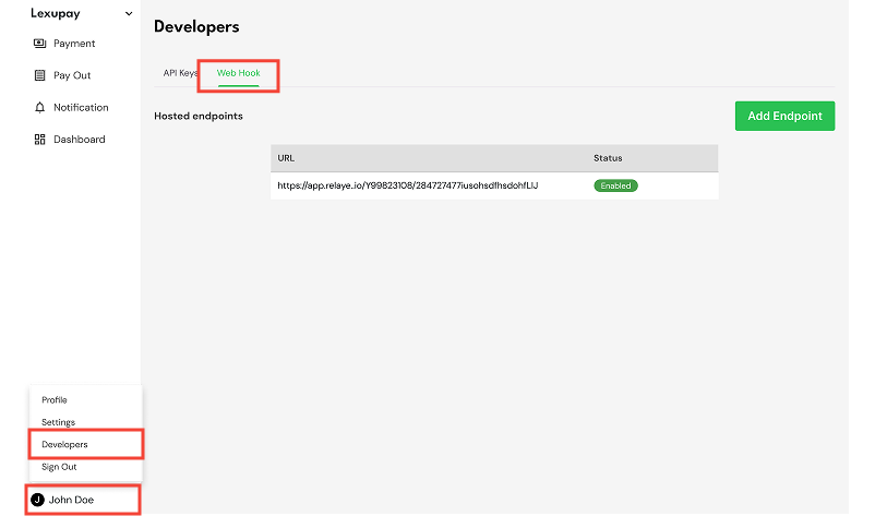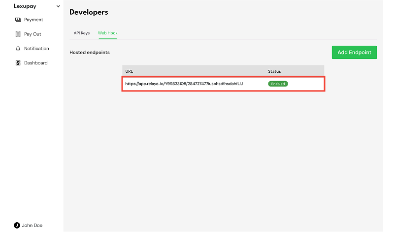 A Webhook is used to receive real-time notifications from the Lexupay system when specific events occur, such as successful or failed payments, or changes in transaction status. By using Webhooks, applications can automatically respond to events in Lexupay without the need for continuous polling to the server. This allows for more efficient and responsive integrations, such as updating order statuses in e-commerce applications, sending confirmation emails to users, or triggering other business processes based on events received from Lexupay.