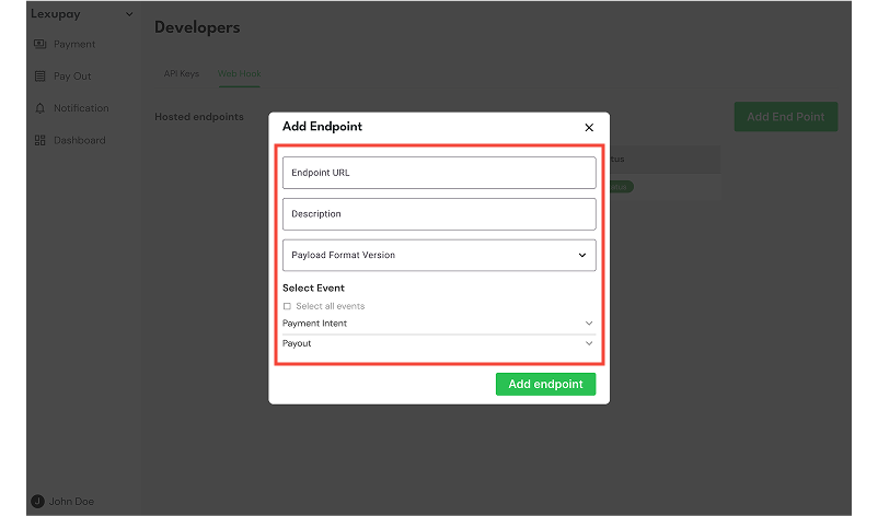 In the Add Endpoint dialog, fill out the endpoint data (Endpoint URL, Description, Payload Format Version, and Select Event).