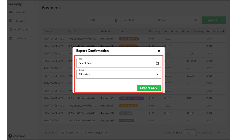 In the Export Confirmation dialog, select the date and status, then choose Export CSV.