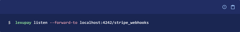 To forward events to your local endpoint, run the following command with the CLI to set up a local listener. The --forward-to flag sends all Lexupay events in test mode to your local webhook endpoint.