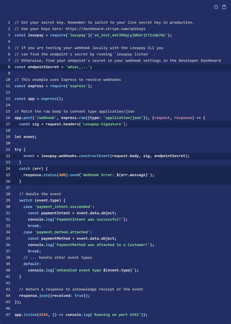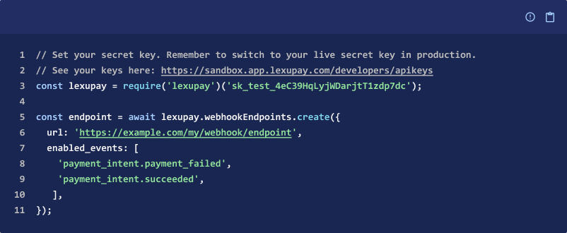 Lexupay generates a unique secret key for each endpoint. If you use the same endpoint for both test and live API keys, the secret is different for each one. Additionally, if you use multiple endpoints, you must obtain a secret for each one you want to verify signatures on, and Lexupay starts to sign each webhook it sends to the endpoint.