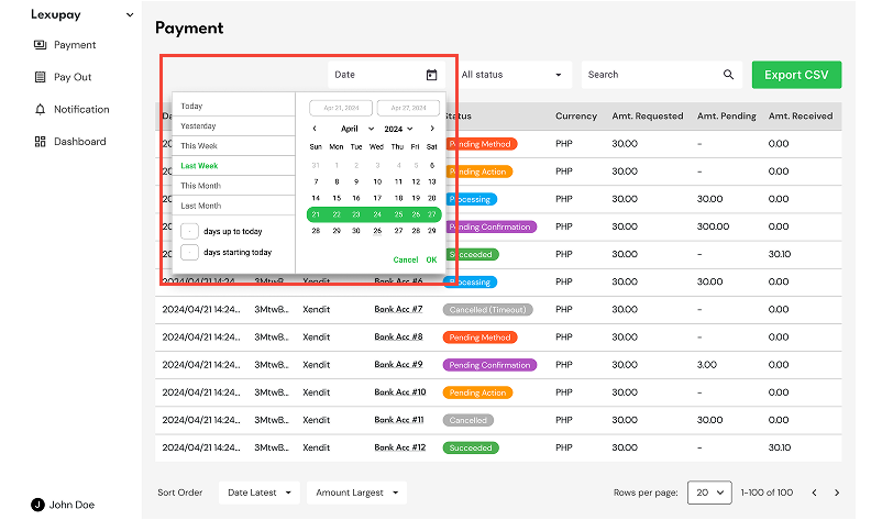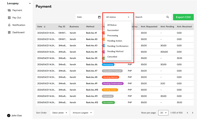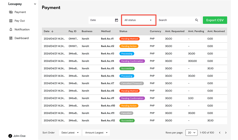 The list of payments will be displayed based on the selected status.