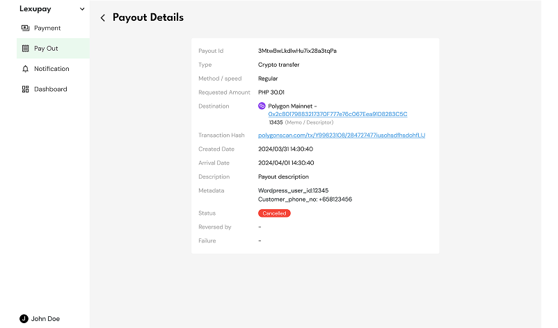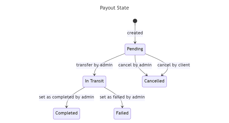 **Cancelled: **The payout status when the client or admin cancels the payment transfer while the payment is still pending.
