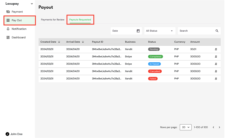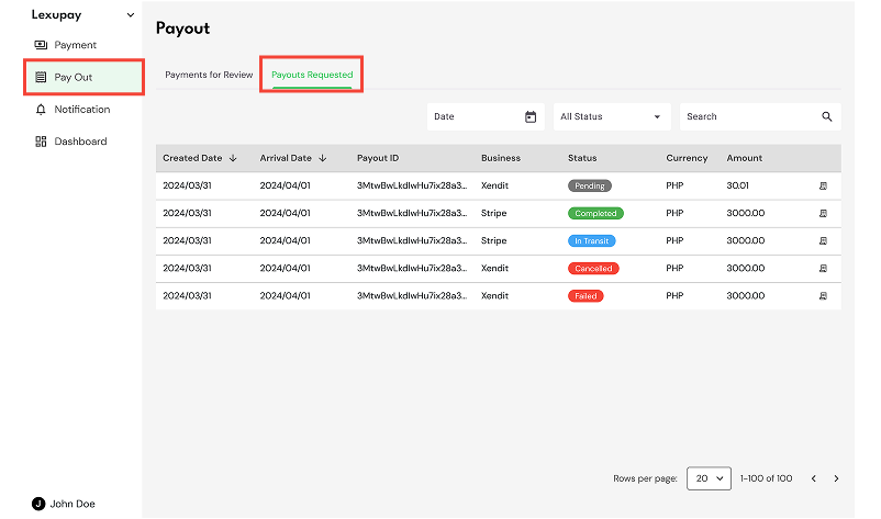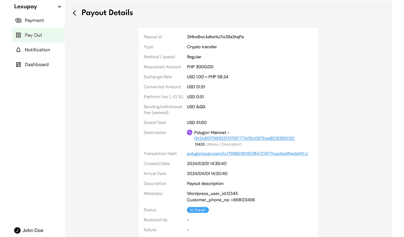 **In Transit: **The payout status when the payment has been transferred by the admin in the system.