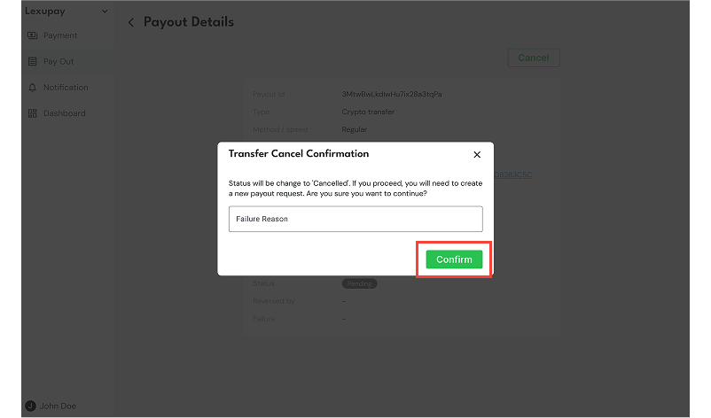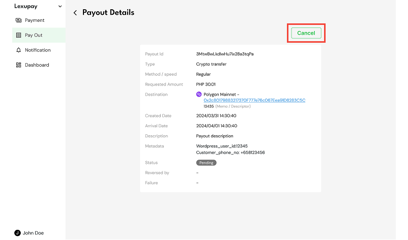 Pending: The payout status immediately after creation. At this stage, we can cancel the payment transfer by selecting Cancel.