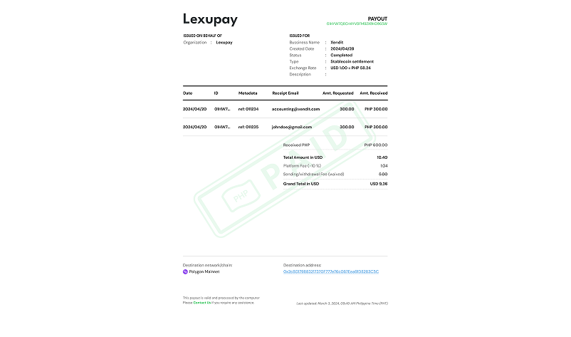 The payout has been successfully downloaded, and the file Payout_2024/04/21.pdf can be opened on our computer.