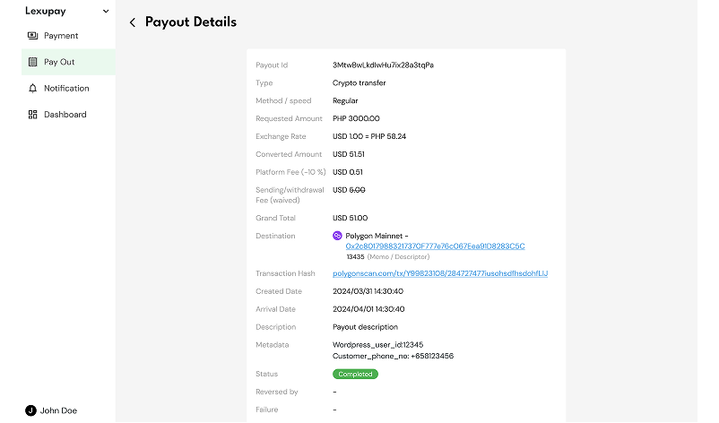 Payout is the process of managing and disbursing payments to eligible recipients. On the payout page, we can view all successfully managed payments. The goal of payout is to ensure that funds or assets sent reach the correct destination address accurately and on time.