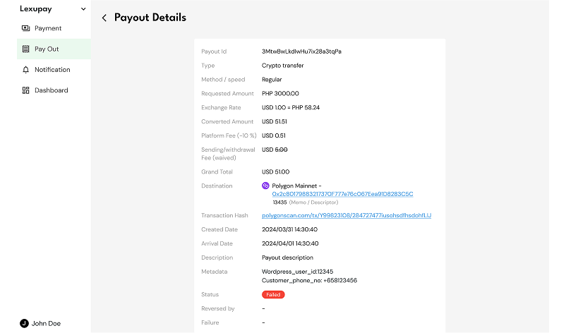 Failed: The payout status when the payment is not received by the recipient or cancelled by the admin at the client's request.