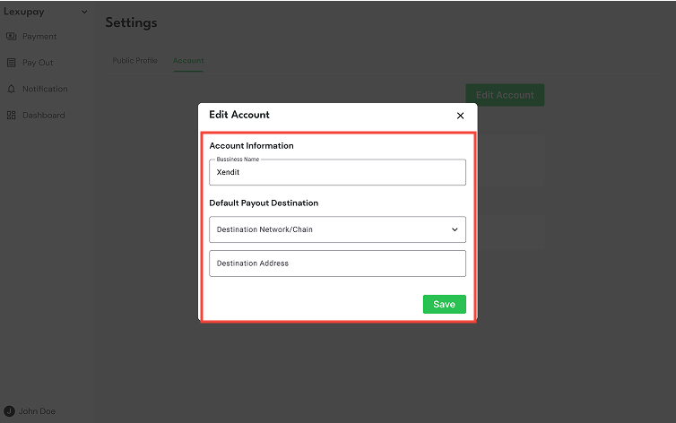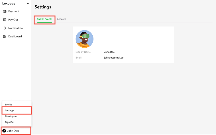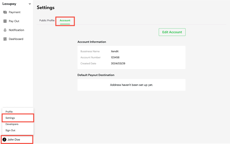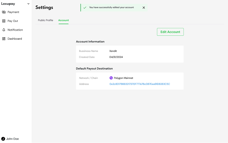 The settings page on LexuPay allows users to customize various aspects of their accounts. Here, users can manage their public profile, including displayed account name and email information. Additionally, users can view business details such as business name, account number, and account creation date. Users also have the option to update their business name, ensuring that all information remains accurate and meets business needs.