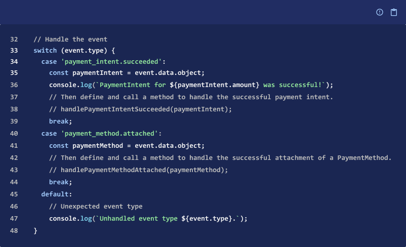 Once we have the event object, check its type to determine what type of event has occurred. We can use one webhook to handle multiple different types of events simultaneously, or set up individual endpoints for specific events.
